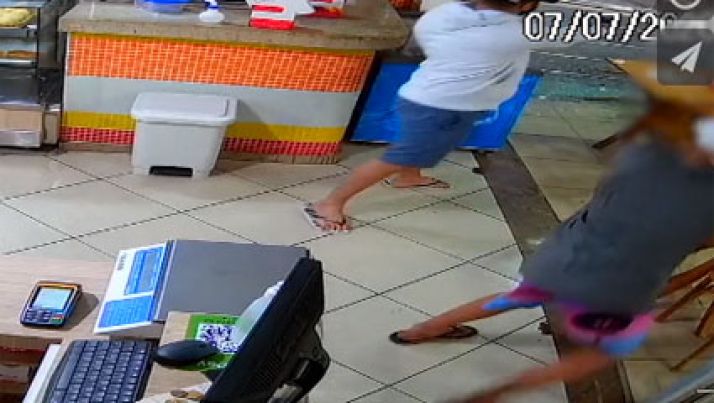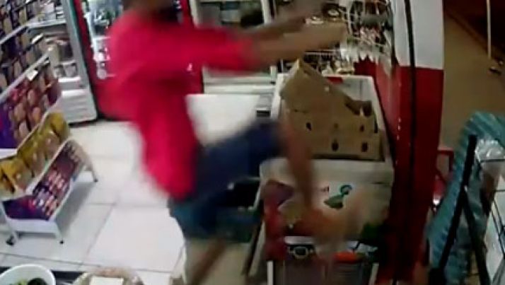 Balconista de mercado reage a assalto e dá "voadora" nas costas de criminoso; veja