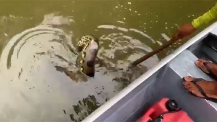 Pescadores são surpreendidos por sucuri gigante tentando “roubar” peixe; veja