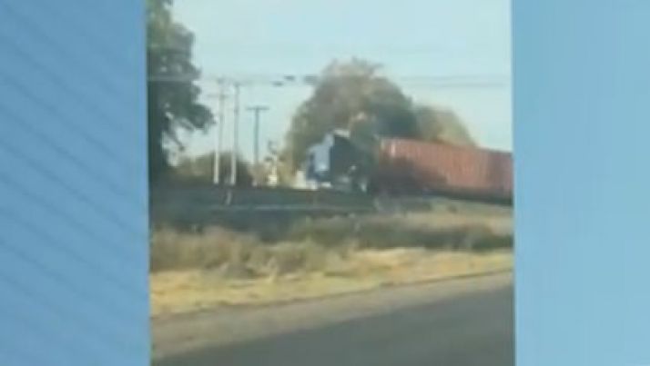 Caminhão é atingido por um trem no cruzamento da linha férrea; veículo ficou preso