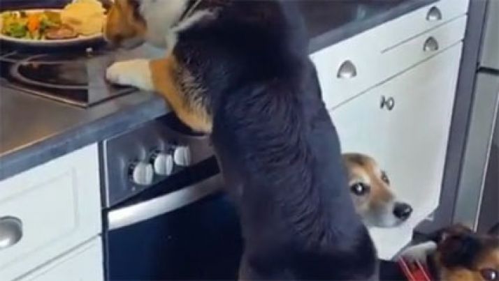 Parceiros de crime: cães se juntam para roubar comida em vídeo hilário