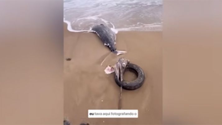 Marlim-azul é encontrado morto com pneu cravado no bico em praia de SC; veja