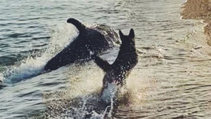 Cão brinca com golfinhos em cena adorável em praia na Ucrânia; veja