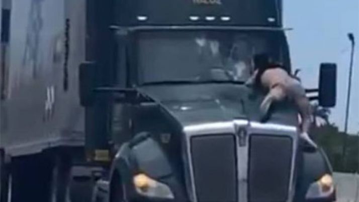 Nos EUA, caminhoneiro dirige com homem agarrado ao capô do veículo; veja
