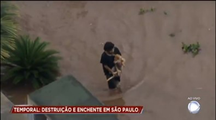 Homem socorre cachorro no meio da enchente em São Paulo