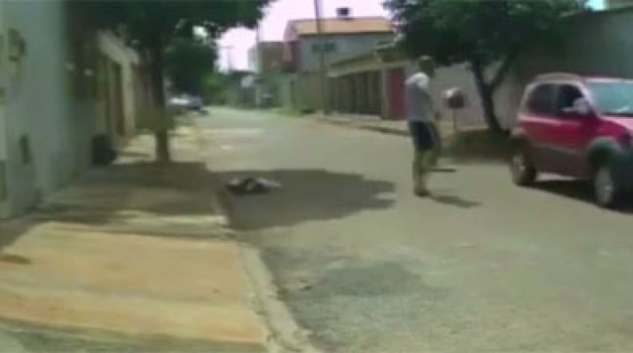 Homem é flagrado agredindo cão com rodo em rua de Goiânia