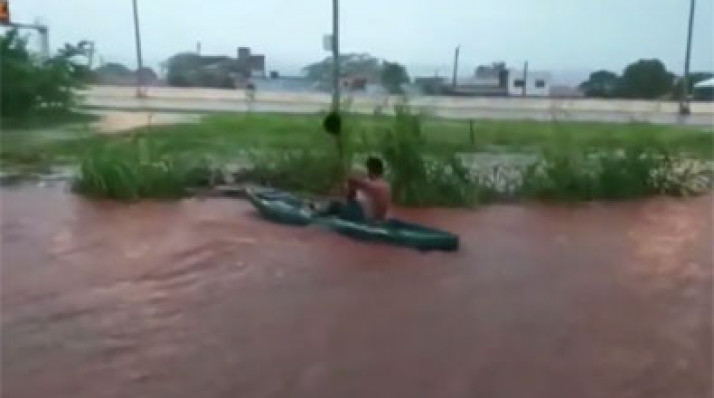 Homem aproveita rua alagada para dar uma volta de caiaque em Goiânia