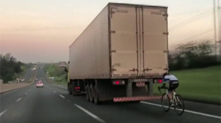 Ciclista é flagrado pedalando 'no vácuo' de caminhão em Rodovia
