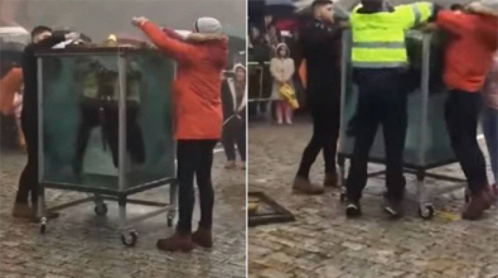 Artista é resgatado ao não conseguir escapar de tanque com água