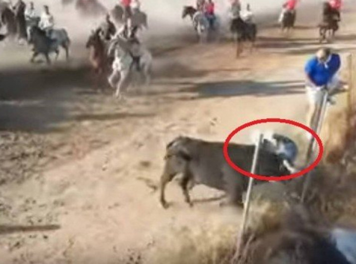 Touro imprensa turista em grade de metal e o chifra três vezes
