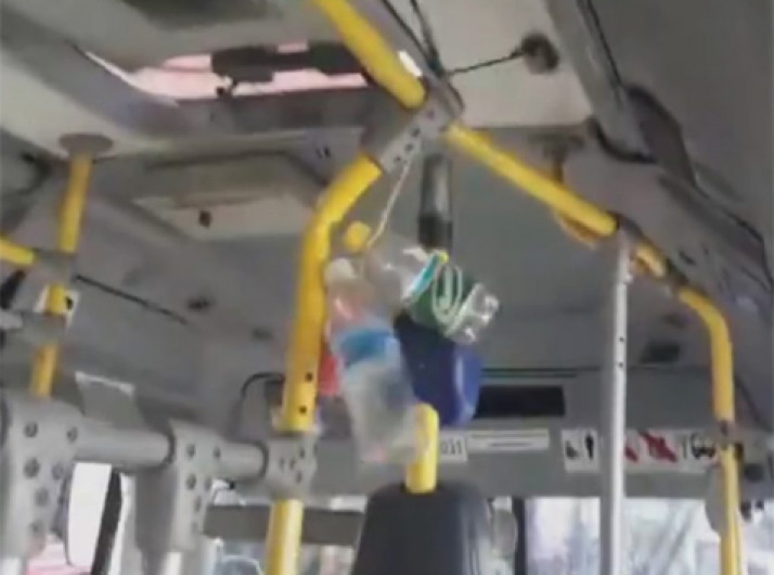 Garrafas pet e latinha amarradas substituem campainha em ônibus