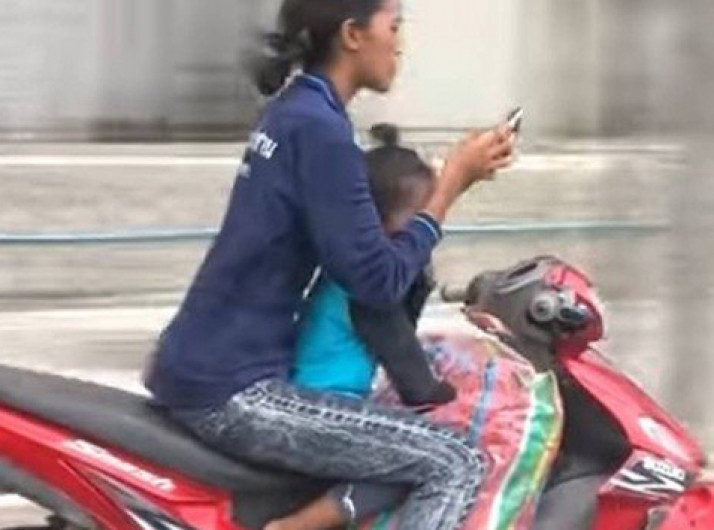 Com criança na sua frente, mulher usa smartphone ao pilotar moto