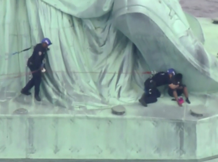 Mulher escala pedestal da Estátua da Liberdade durante protesto e é detida