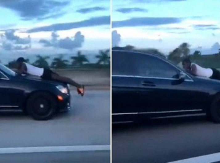 Homem pega 'carona' bizarra sobre o capô de carro a 100km/h