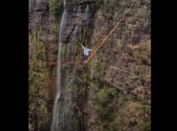 Cuiabano atravessa cachoeira mais alta de MT em fita de highline