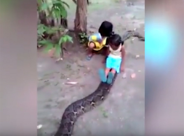 Meninas brincam de "cavalinho" em píton gigante na Indonésia