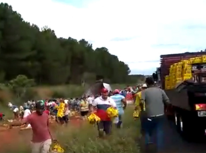 Pessoas levam carga de cerveja após caminhão tombar em SP