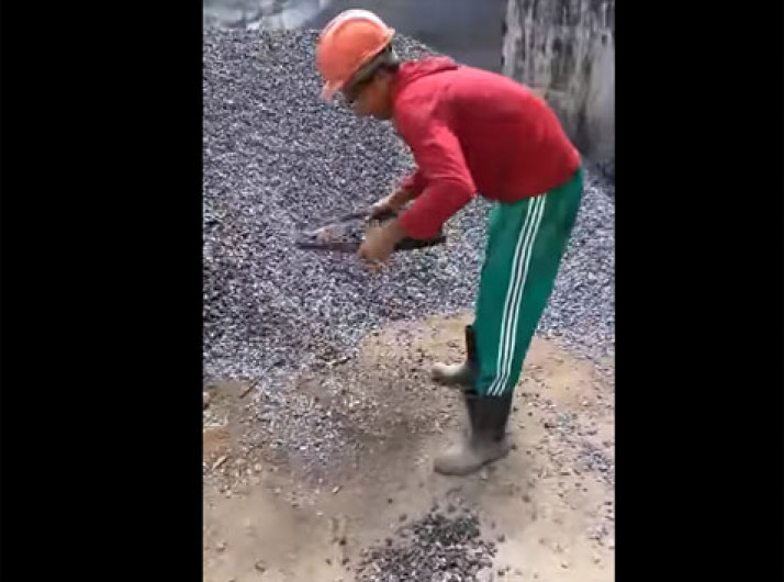 Servente é flagrado “peneirando” pedra para fazer concreto
