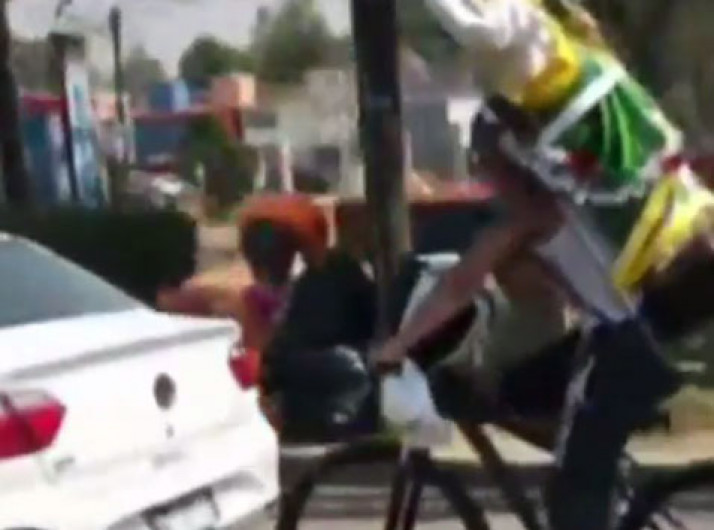 Ciclista carregando imagem de Jesus, se distrai e sofre acidente hilário