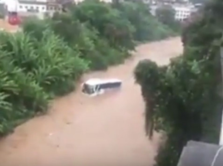 Ônibus é arrastado por rio e bate em ponte durante chuva no RJ