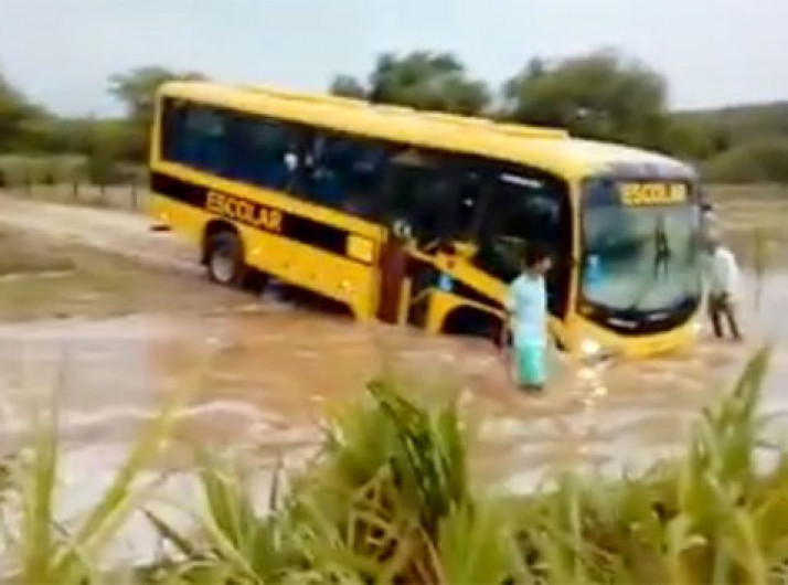 Motorista de ônibus arrisca vida de crianças ao tentar atravessar riacho