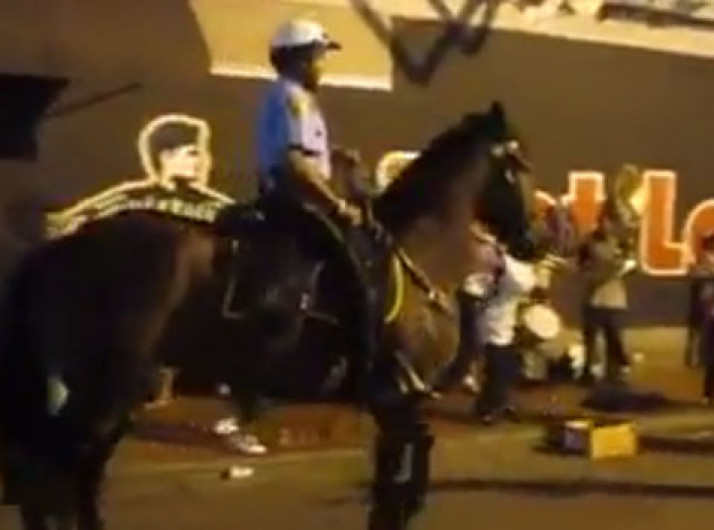 Cavalo da polícia passa por uma banda e não resiste em cair na dança