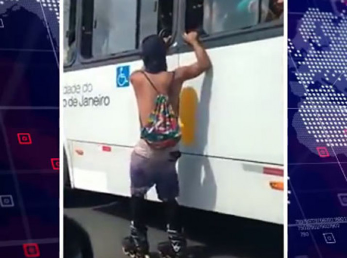 Homem de patins pega "carona" em ônibus do Rio de Janeiro