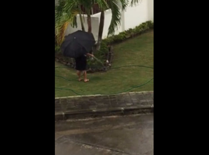 Entediada com a chuva, ela resolveu ir molhar o gramado