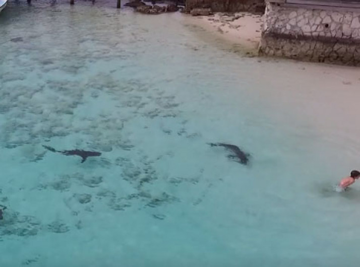Drone flagra criança nadando com quatro tubarões nas Bahamas