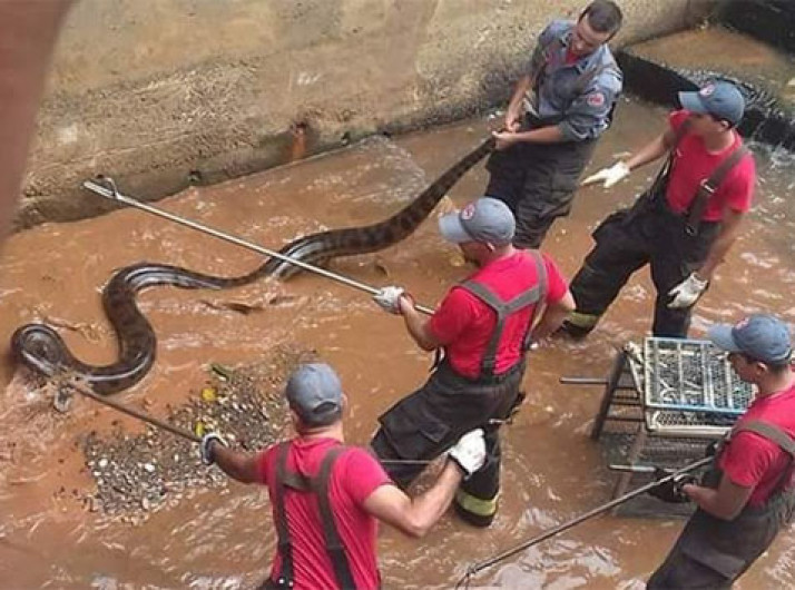Sucuri de 5 metros é achada em córrego e ataca bombeiro