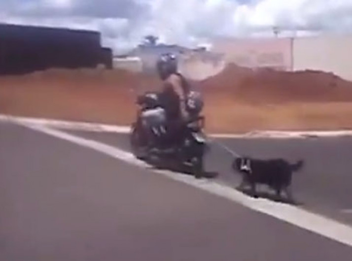 Imagens mostram motociclista em movimento puxando cão pela coleira
