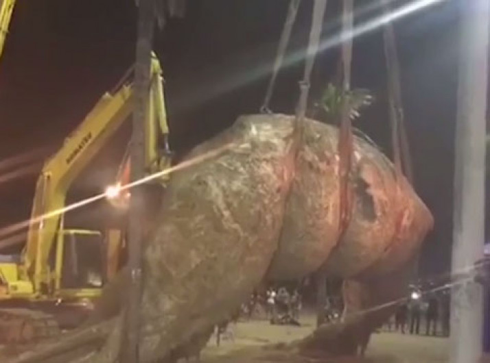 Baleia morta é retirada por 3 escavadeiras, guincho e carreta no Rio