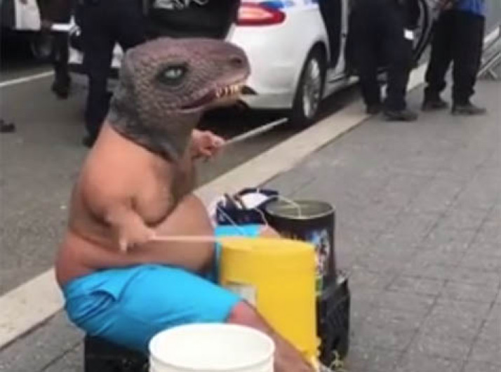 Dinossauro humano tocando tambor nas ruas de Nova York