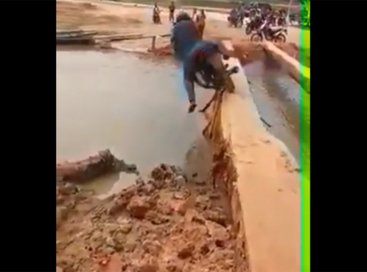 Homem tenta passar com a moto em ponte e acaba caindo no rio; veja