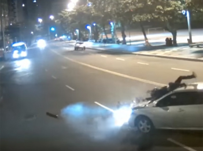 Câmera flagra acidente em que piloto vai parar no para-brisa do carro