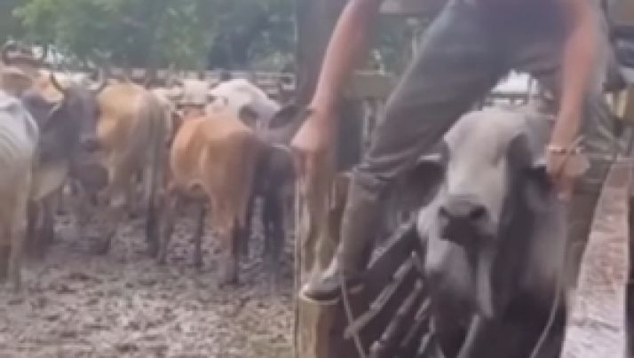Homem tenta montar em boi, leva golpe certeiro e cai de cara na lama; veja