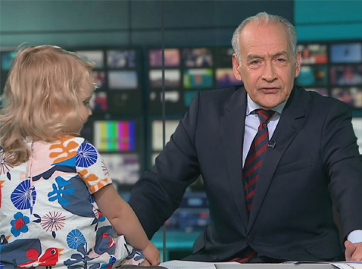 Menina escala mesa de apresentador e rouba a cena em programa ao vivo