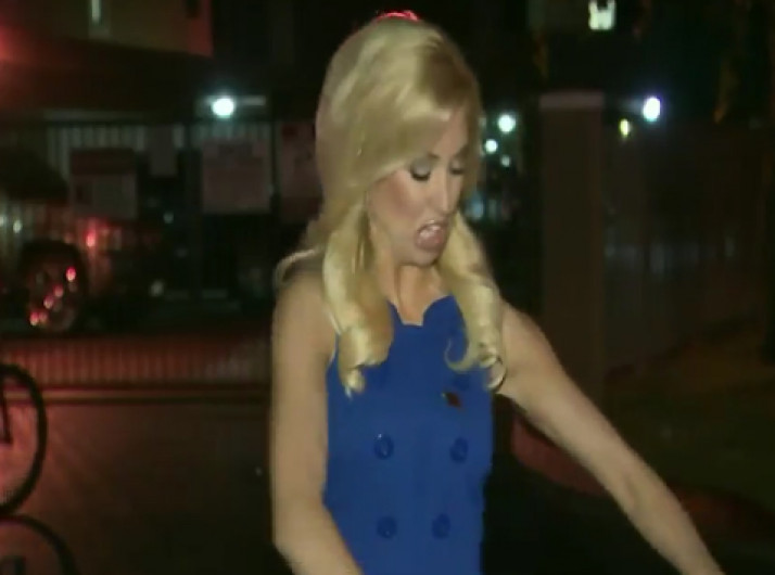 Barata pousa em vestido de repórter pouco antes de entrada ao vivo