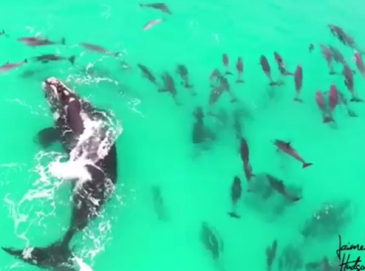 Drone flagra baleia 'brincando' com grupo de golfinhos