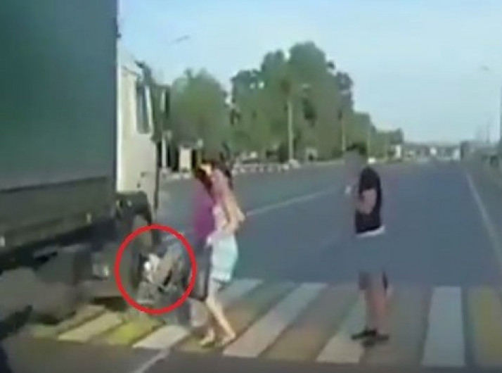 Bebê em carrinho escapa por um triz de atropelamento por carreta