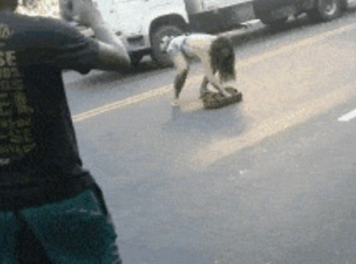 Mulher 'sem medo' tira com as mãos jiboia que estava no meio de estrada