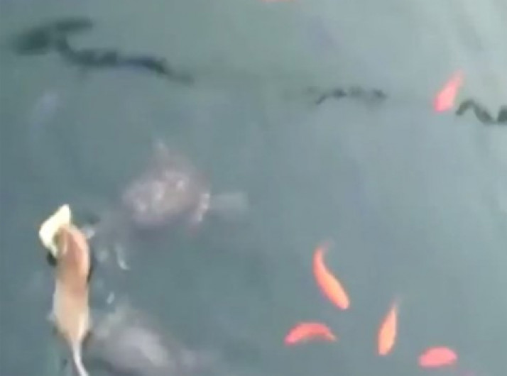 Rato se joga na água e rouba comida de peixes e tartarugas