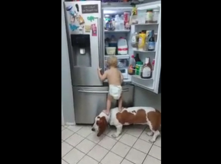 Garoto de 2 anos "assalta" geladeira com ajuda de comparsa canino