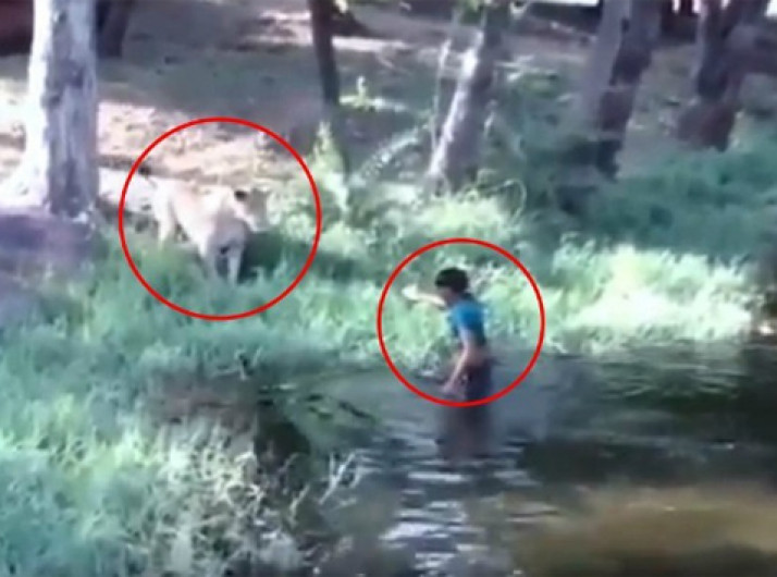 Homem salta na área reservada aos leões para cumprimentá-los