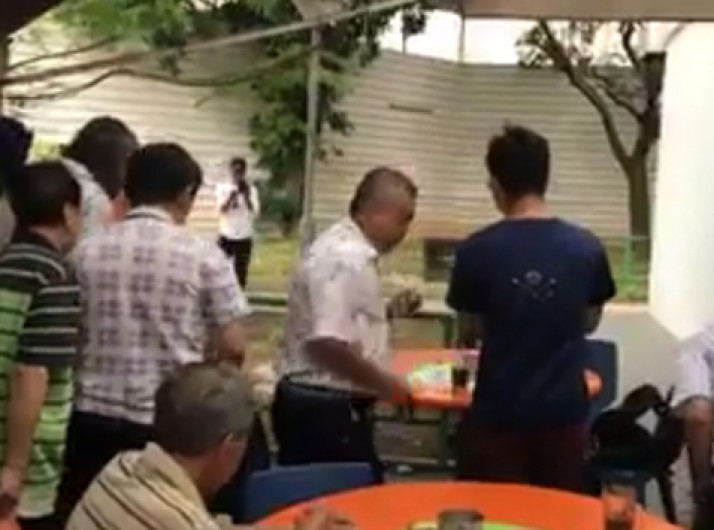 Idoso come enquanto clientes se assustam por causa de cobra