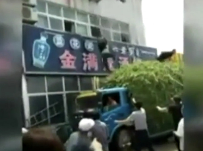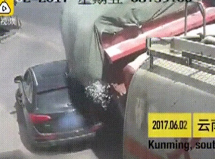 Caminhão de cascalho tomba sobre carro em acidente na China