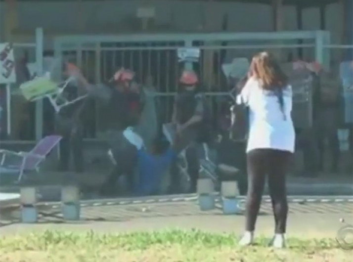 Policial militar usa cadeira de praia para atingir manifestante