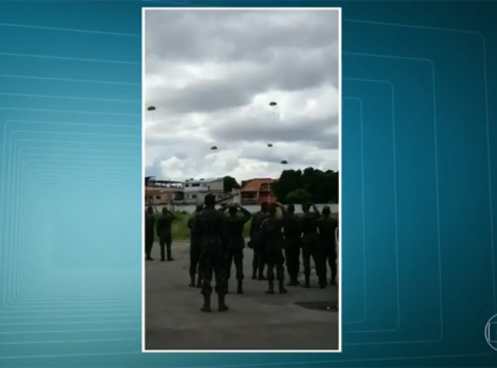 Imagens mostram paraquedistas do exército caindo em telhado de casas