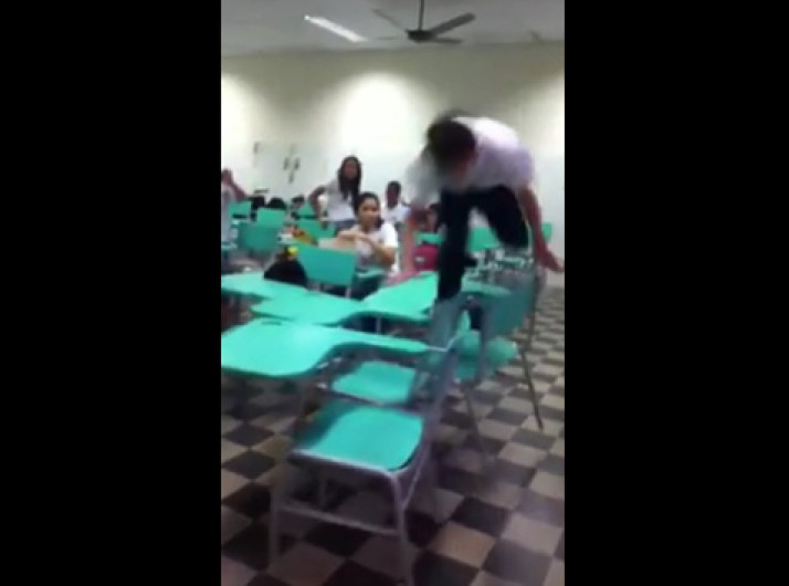 Em sala de aula, aluno tenta pular carteiras e acaba levando um tombo