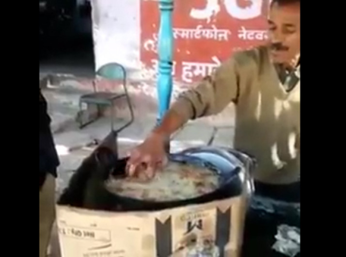 Homem retira frango frito do óleo fervendo com a mão e não se queima