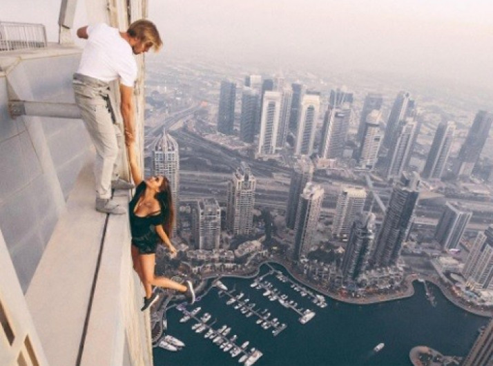 Modelo fica pendurada a mais de 300 metros de altura sem segurança